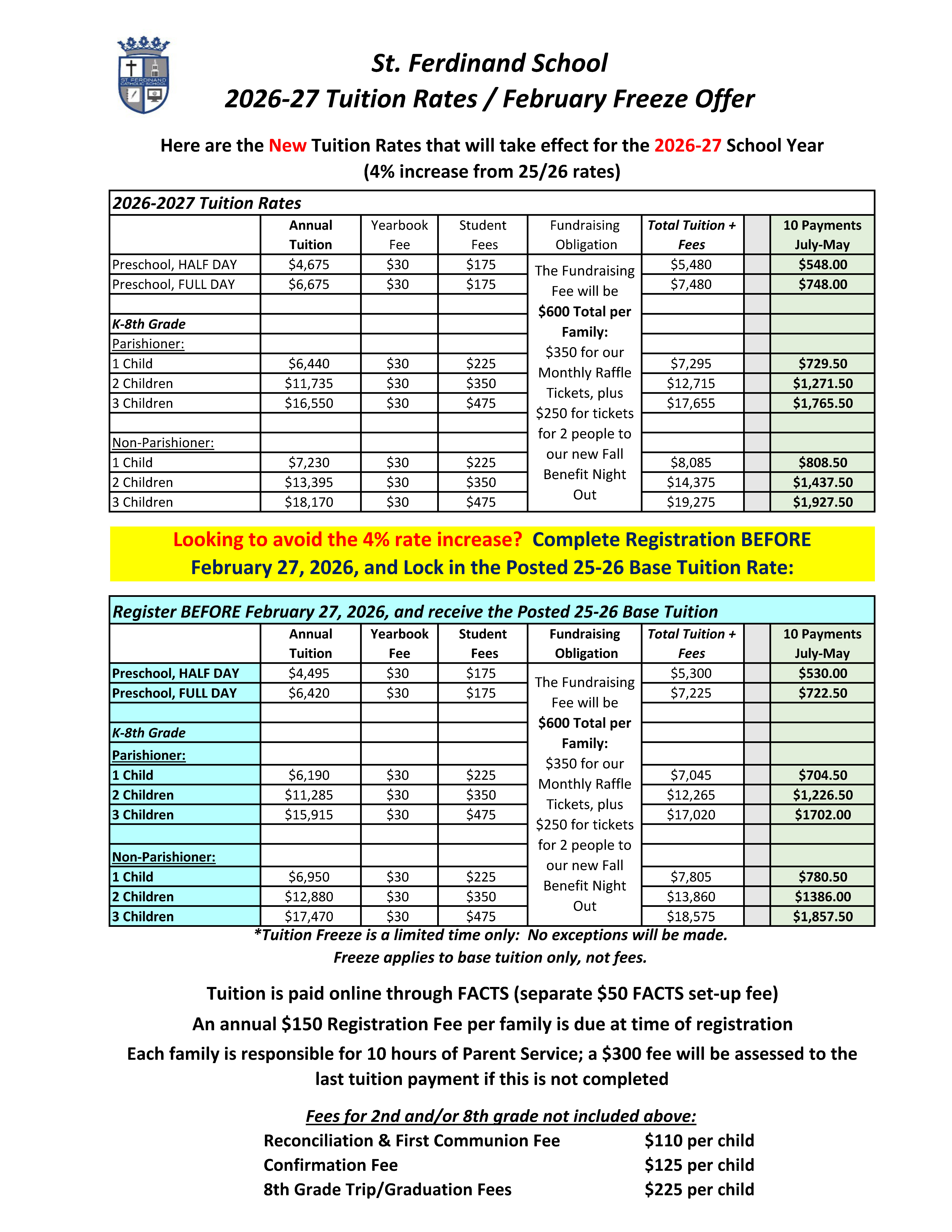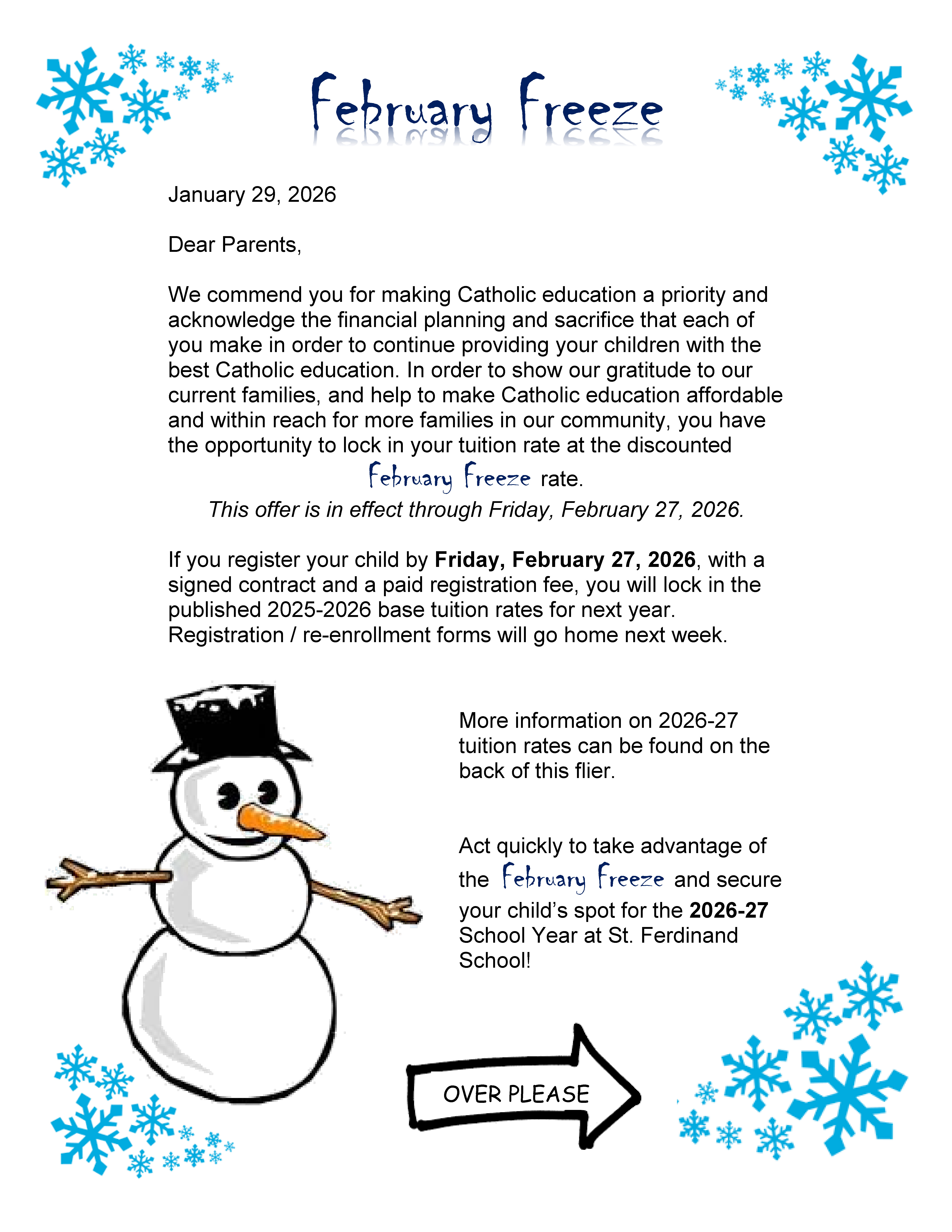 We are pleased to announce that we are once again offering our February Freeze Discount! If you complete your Registration for the 2026-27 School Year prior to February 27, 2026, you will be eligible for our February Freeze discount ….. Receive the published base 2025-26 Tuition Rates for the 2026-27 School Year!